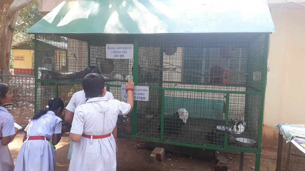पालतू क्षेत्र में गिनी सूअर और खरगोशों को देखने के लिए उत्सुक बच्चे
